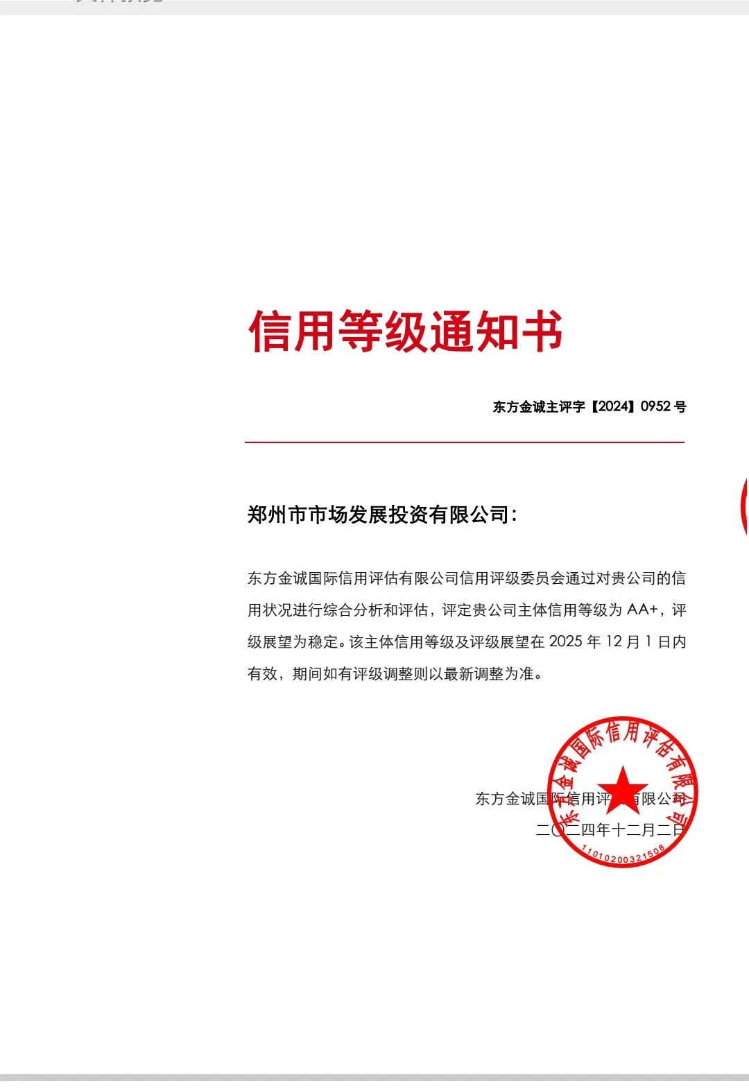 鄭州市市場發(fā)展投資有限公司再獲AA+主體信用評級