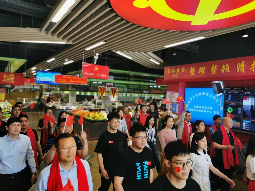 ? ? ? 上午9時(shí),伴隨著悠揚(yáng)的音樂聲,公司員工一邊揮舞著手中的黨旗,一邊放聲歌唱,緩緩從喧鬧的市場(chǎng)中走出,一場(chǎng)持續(xù)約6分鐘的紅歌“快閃”活動(dòng)讓濃濃的愛黨愛國(guó)情愫涌動(dòng)在每個(gè)人的心里?;顒?dòng)現(xiàn)場(chǎng),在音樂旋律的感染下,前來(lái)購(gòu)物的市民以及市場(chǎng)商戶也從四面八方匯聚而來(lái),有的掏出手機(jī)拍照,有的一起參與,深情的歌聲漸漸演變成大合唱,所有人用慷慨激昂、精神飽滿的歌聲表達(dá)出對(duì)偉大中國(guó)共產(chǎn)黨的真誠(chéng)歌頌。大家用紅色的海洋、激昂的情感、高亢的歌聲,展現(xiàn)著新時(shí)代共產(chǎn)黨員的風(fēng)采。